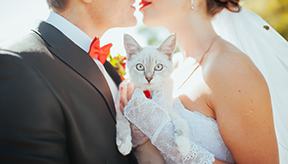 Cats, like children, could be wild cards and unpredictable in their actions on the planned day. Unless you are getting married at home and have a really mellow cat who will happily walk on a leash and be cooperative, it’s probably a better idea to only include her in the wedding photographs. The same could probably be said for birds. It’s all very well having your parrot sit on a groomsman’s shoulder, until it poops….