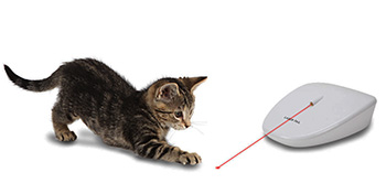 This interactive laser toy moves by itself across the floor in random patterns and in all directions. The laser is on the back of the toy so the laser light is always rolling away from the cat, encouraging the chase. Sensors help the toy find its way out of corners or out from under furniture. It automatically shuts off after 10-minutes of play. It works well on all kinds of floor surfaces such as wood, tile and short-tufted carpets. While such toys utilize low-powered lasers such as 5mW 3R class lasers that are certified safe around pets and people, laser beams must never be shone directly at a pet (or a person). Laser toys should always be used under supervision. Petsafe.net