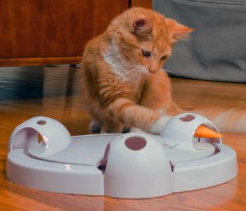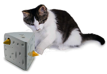 This “chunk” of Swiss cheese has holes on both sides that allow peek-a-boo mice to pop out on either side. Cats love the surprise and anticipation! The Cheese has a timer that automatically turns the toy off after 10 to 15 minutes. There is also a play-while-you-are-away mode which allows for sessions to be programmed to keep cats engaged throughout the day. Petsafe.net