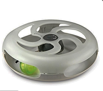 The Stir Crazy from Petlinks is an electronic cat toy with a furry tail that pushes a ball around an electronic track and is spurred on when cats poke their paws through the sides of the track to attempt to catch it. It offers four different play speeds. The ball can be filled with catnip to add to the fun and frenzy. The on-off button is on the top flat surface of the toy so clever cats can be taught to operate it themselves. Petlinkssystem.com