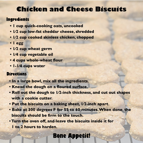 • Finally, spoil your dog by baking him his favorite cookies. A new book, “Doggy Desserts: 125 Homemade Treats for Happy, Healthy Dogs” by Cheryl Gianfrancesco, offers 125 droolicious recipes that are easy to make. Here is the recipe for Chicken and Cheese Biscuits, which makes approximately 90 two-inch biscuits—so you have give some to your dog’s favorite friends, too.